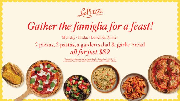 Terms and conditions apply. Offer available in Pizzeria, Monday to Friday for lunch and dinner, for a limited time only. Not available on public Holidays.